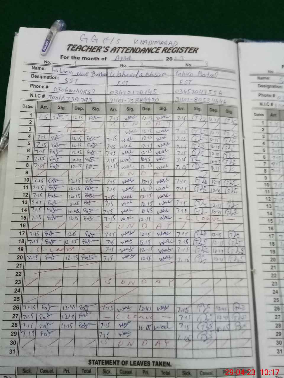 | CNIC | Full Name | Designation | R/C | Absence During Last Calender Month |