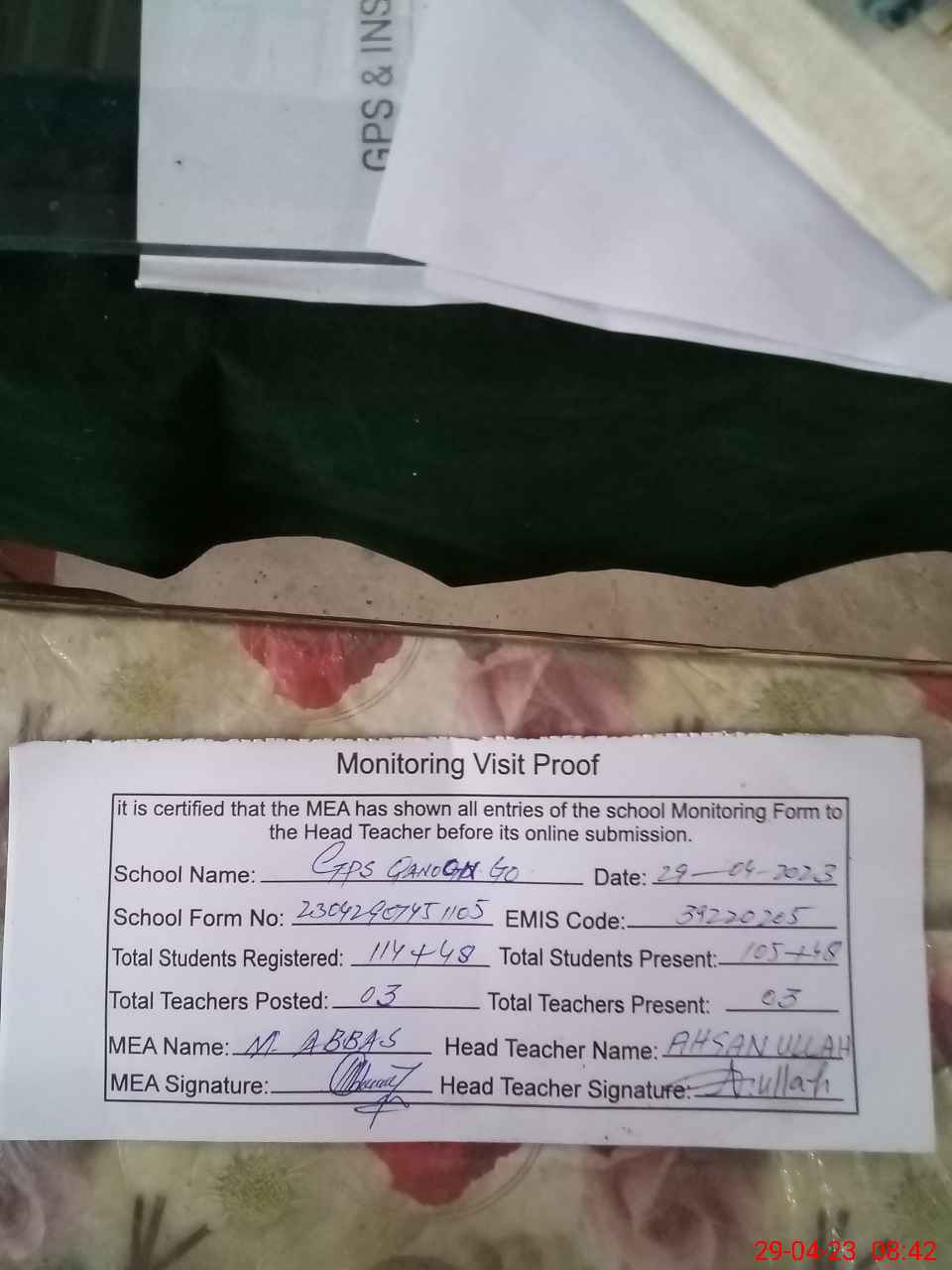 | Monitoring Date: 29-04-2023 | Start Time: 29-04-2023 07:45 AM | End Time: 29-04-2023 08:42 AM | Name of MEA: Mu**** Ab**** | |