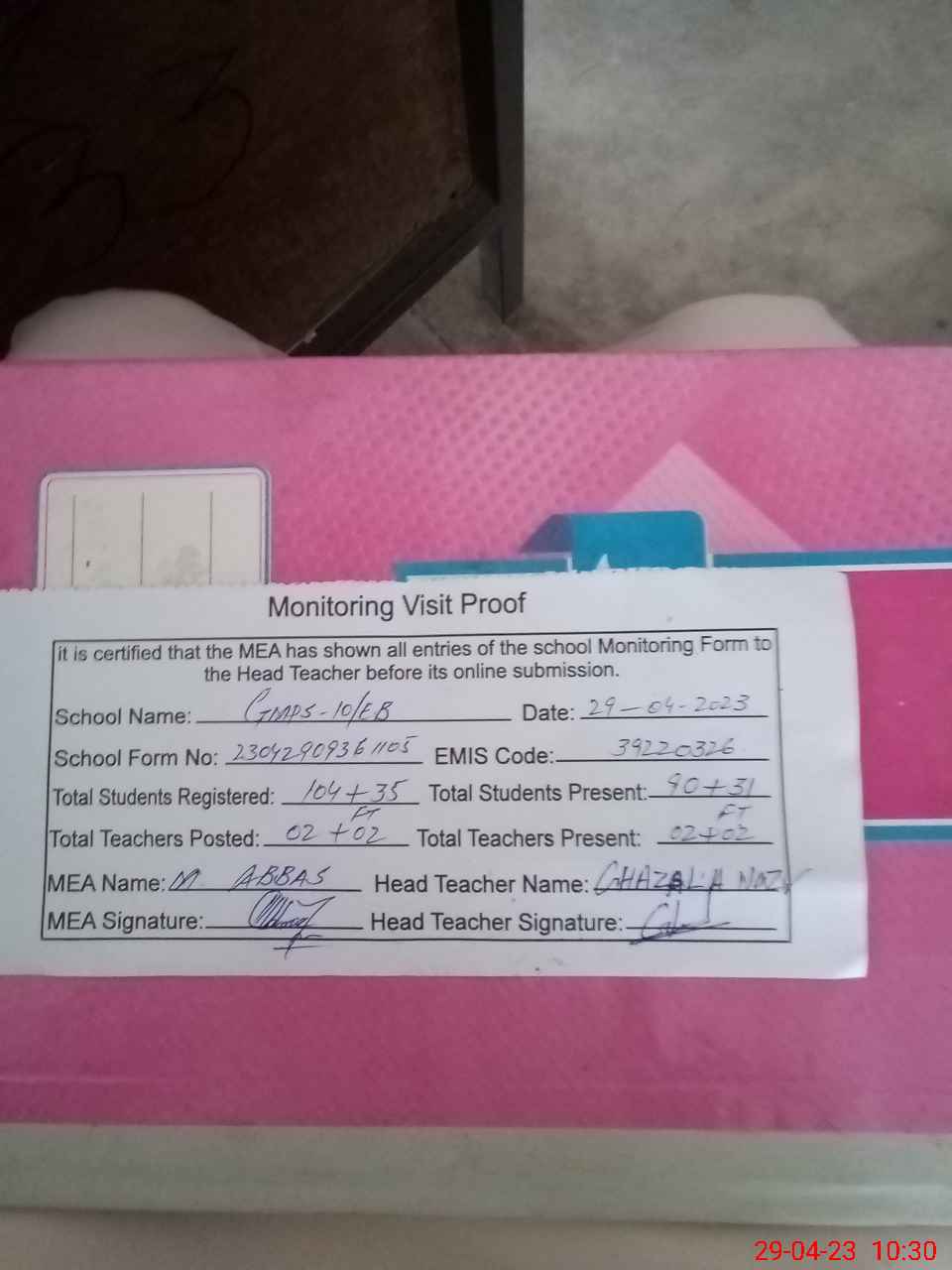 | Attendance Register | Head Teacher | MEA with School | Visit Proof |