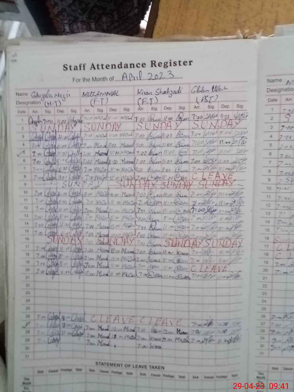 | CNIC | Full Name | Designation | R/C | Absence During Last Calender Month |