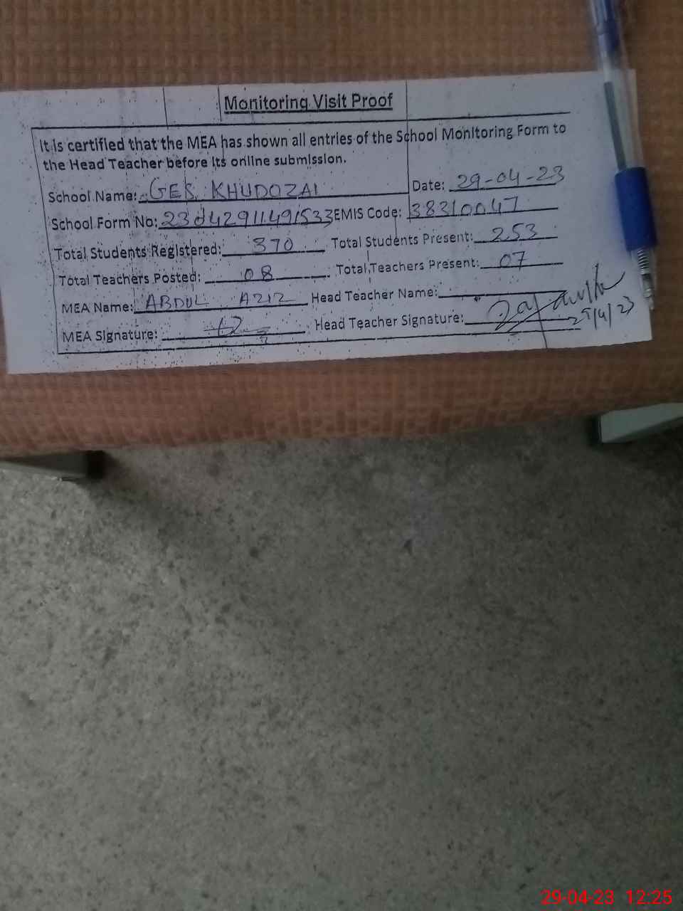 | EMIS Code: 38310047 | Name of School: GES KHUDOZAI | |||