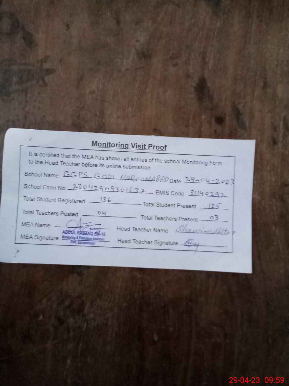 | EMIS Code: 31140292 | Name of School: GGPS GODI REHMAN HAROON ABAD | |||