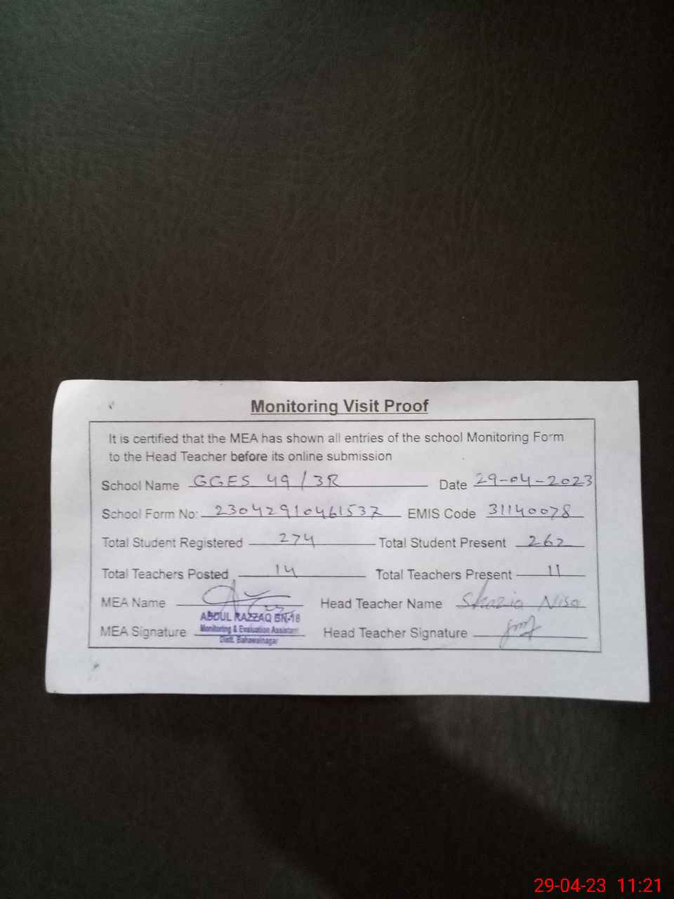 | Attendance Register | Head Teacher | MEA with School | Visit Proof |