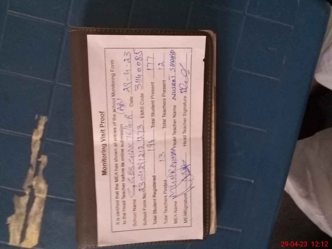 | Attendance Register | Head Teacher | MEA with School | Visit Proof |