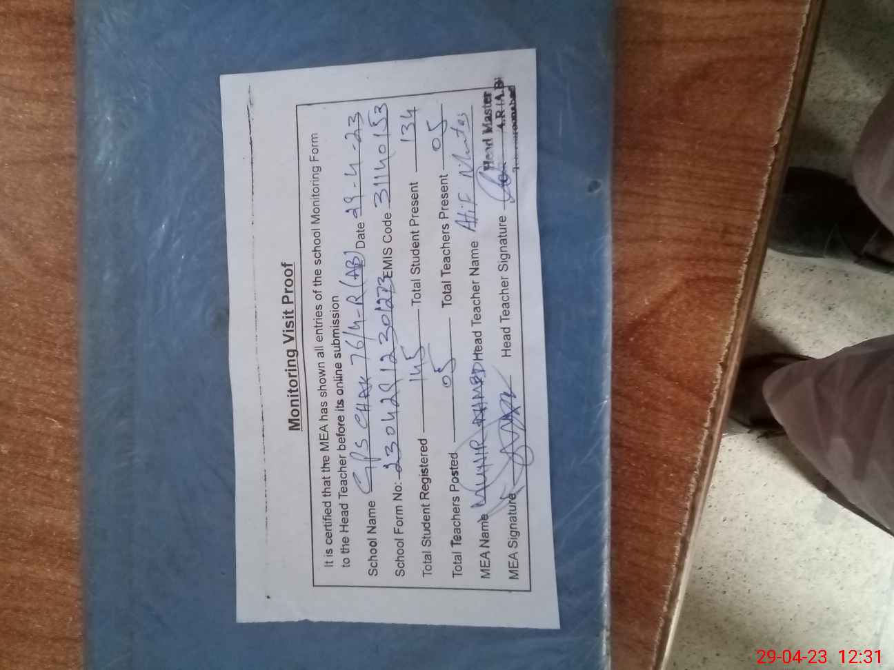 | Attendance Register | Head Teacher | MEA with School | Visit Proof |