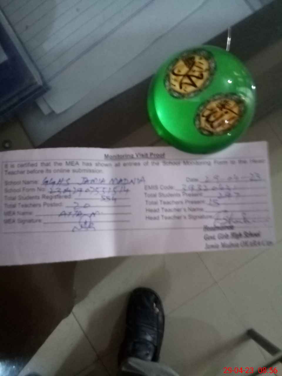 | Attendance Register | Head Teacher | MEA with School | Visit Proof |