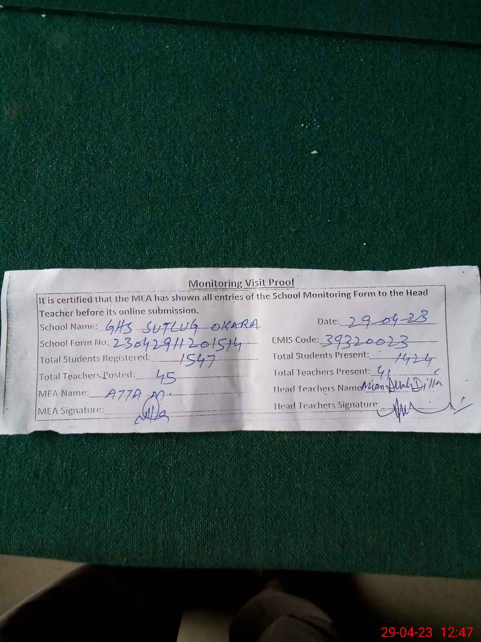 | EMIS Code: 39320023 | Name of School: GHS SUTLUJ OKARA | |||