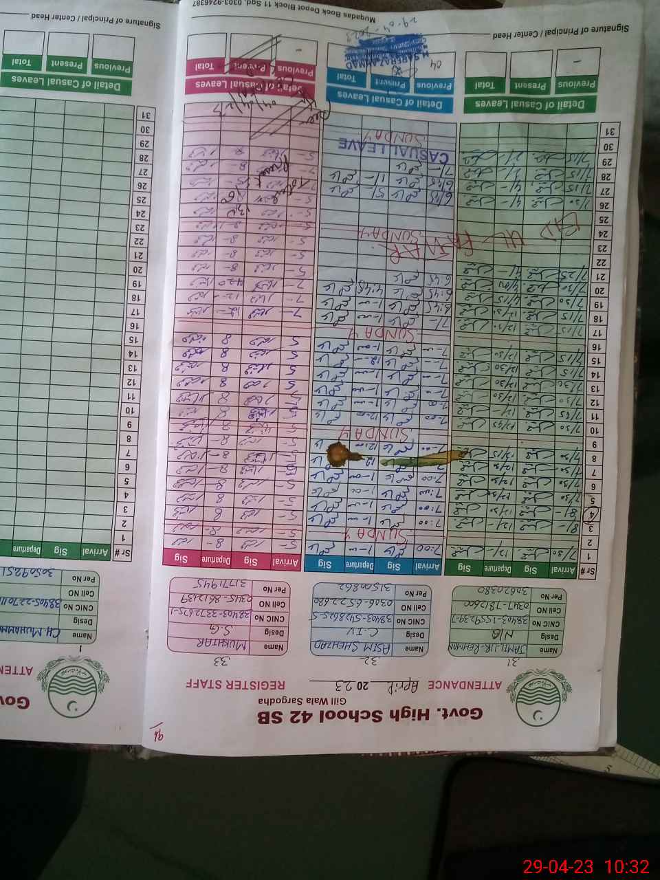 | CNIC | Full Name | Designation | R/C | Absence during last cal. month |