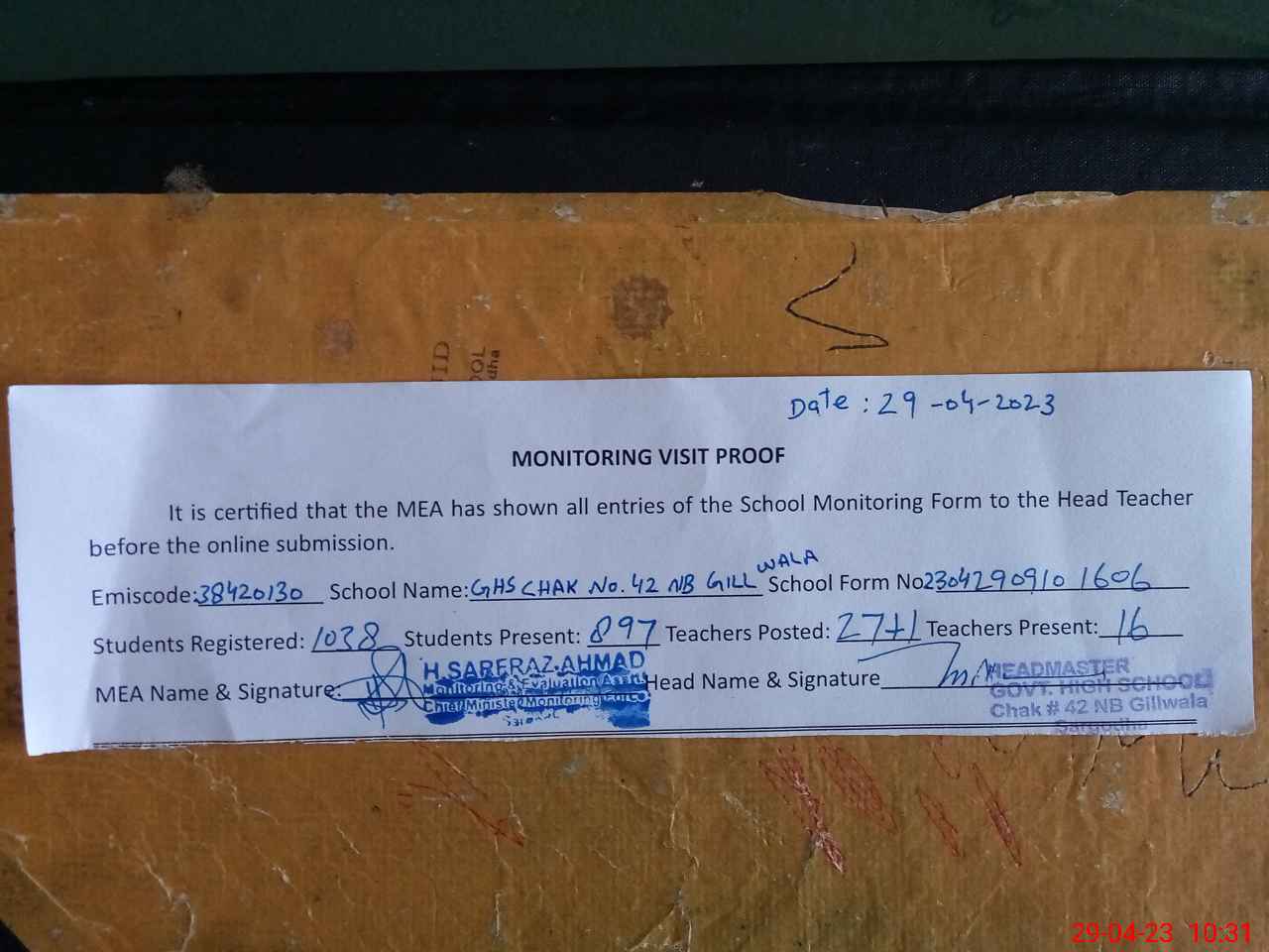| Attendance Register | Head Teacher | MEA with School | Visit Proof |