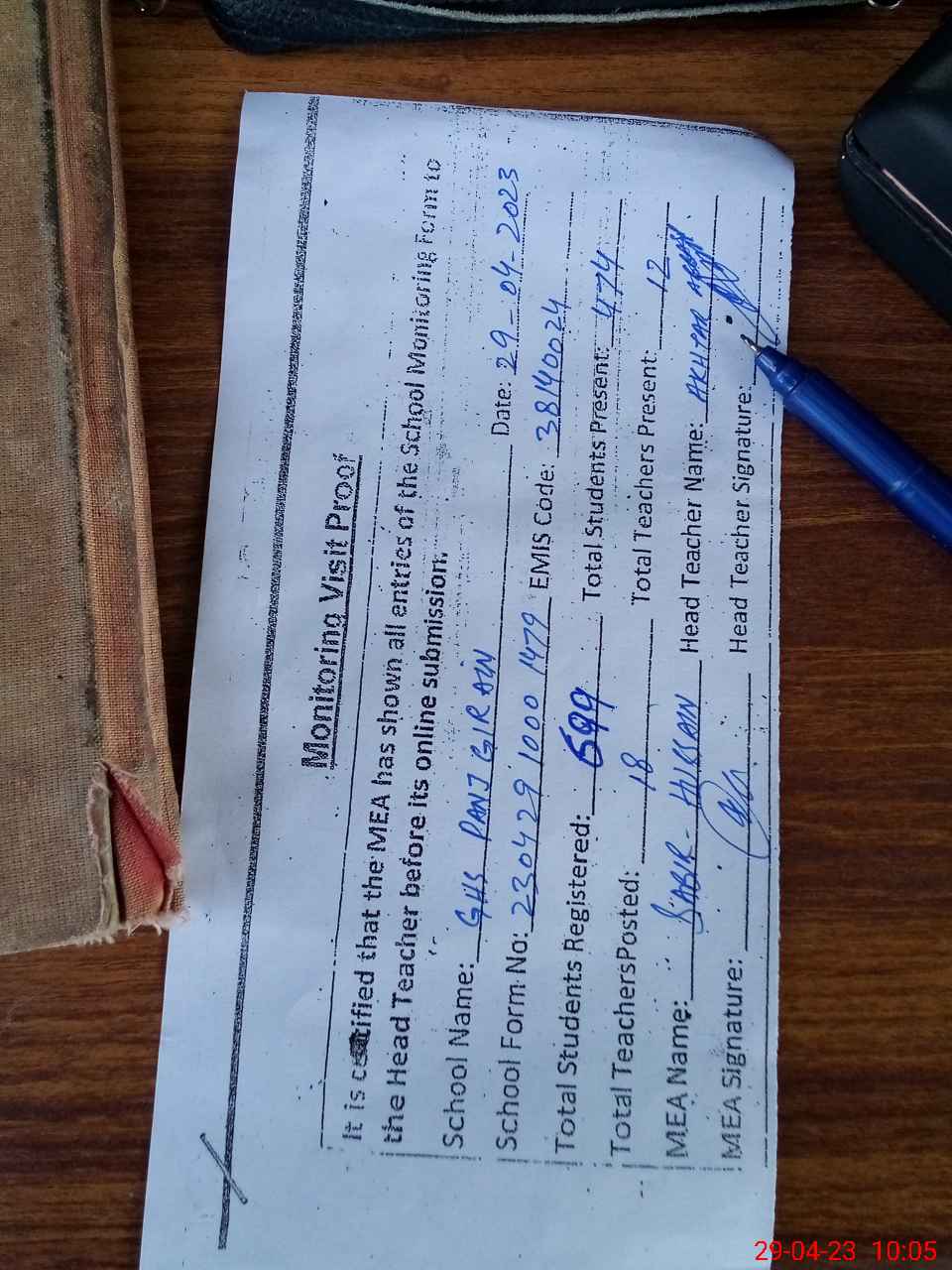 | Attendance Register | Head Teacher | MEA with School | Visit Proof |