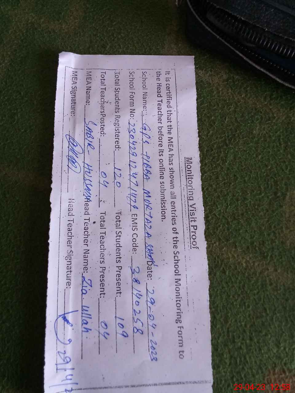 | Attendance Register | Head Teacher | MEA with School | Visit Proof |