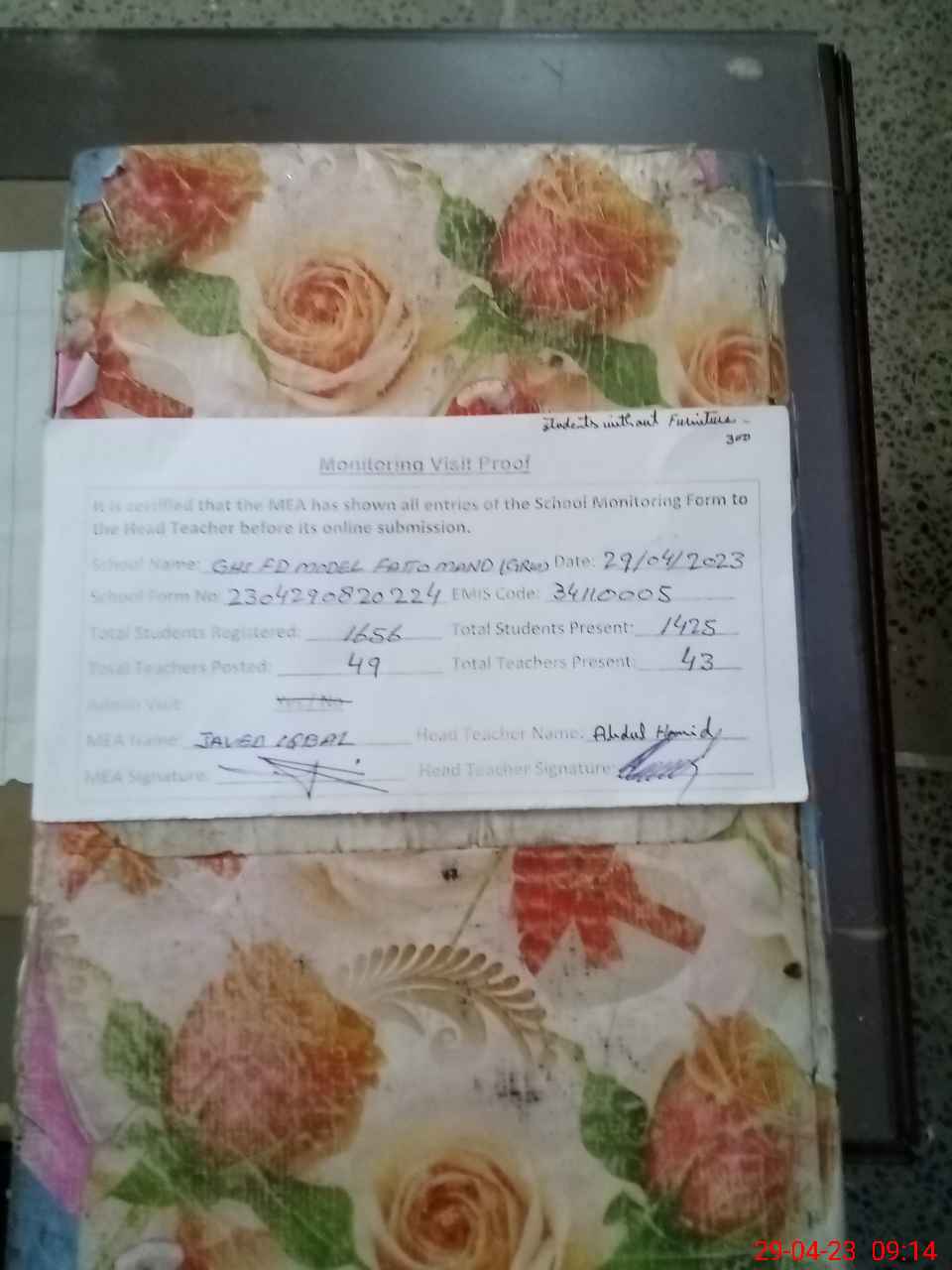 | Attendance Register | Head Teacher | MEA with School | Visit Proof |