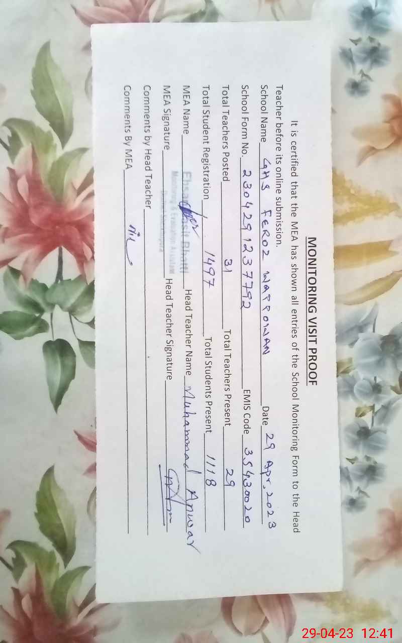 | EMIS Code: 35430020 | Name of School: GHS FEROZ WATTOWAN | |||