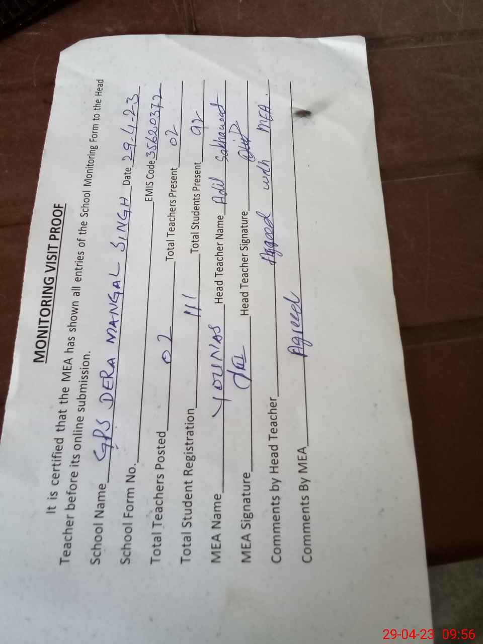 | EMIS Code: 35620372 | Name of School: GPS DERA MANGAL SINGH | |||