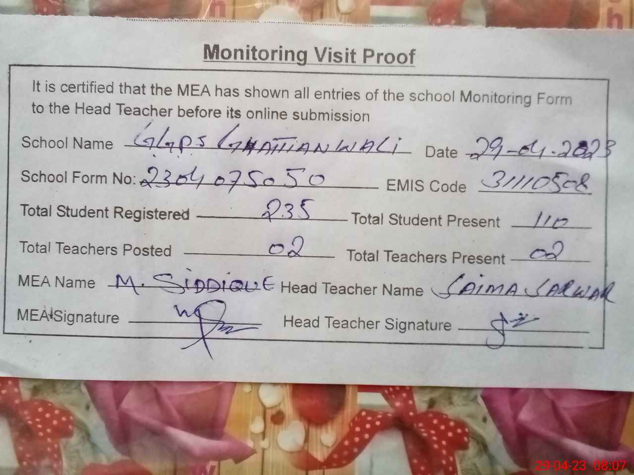 | EMIS Code: 31110508 | Name of School: GGPS GHATTIAN WALI | |||