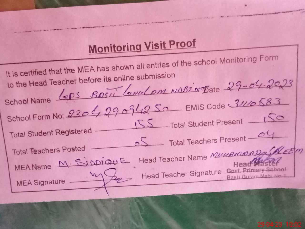 | EMIS Code: 31110583 | Name of School: GPS BASTI GHULAM NABI NO. 1 | |||