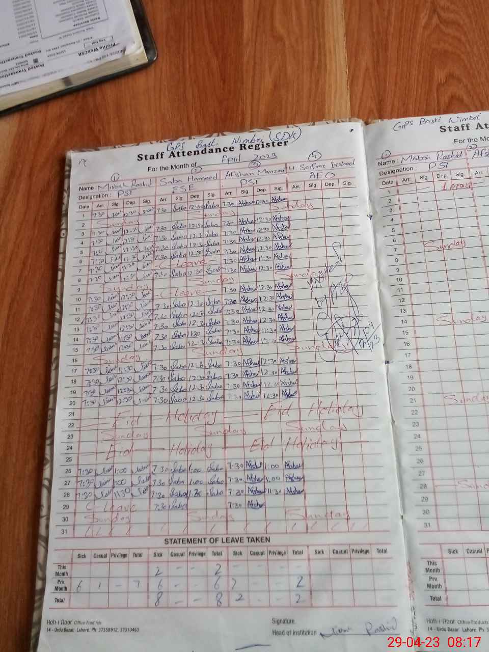 | CNIC | Full Name | Designation | R/C | Absence During Last Calender Month |