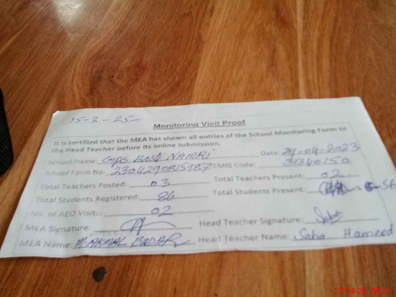 | Attendance Register | Head Teacher | MEA with School | Visit Proof |