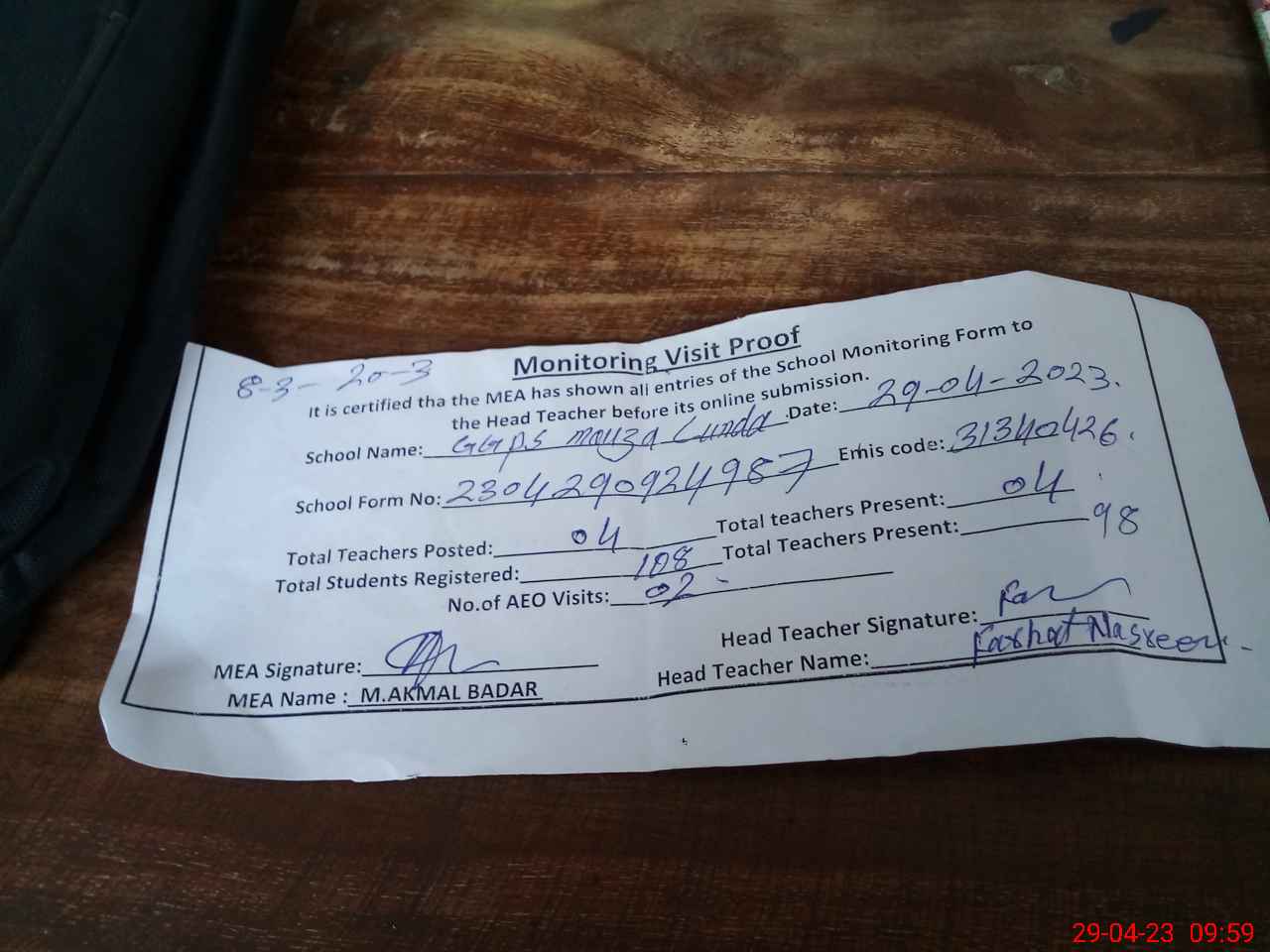 | Attendance Register | Head Teacher | MEA with School | Visit Proof |