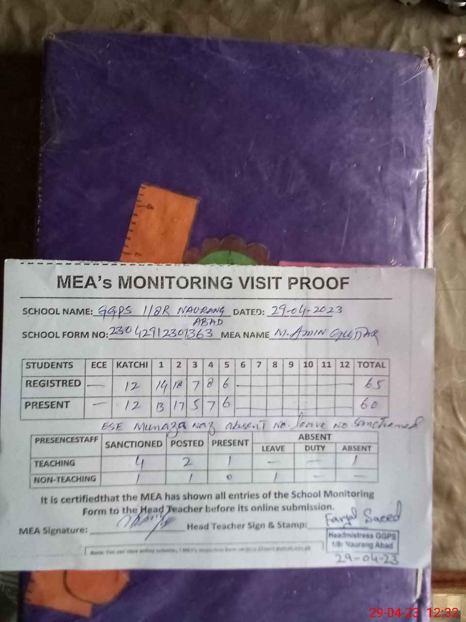 | Attendance Register | Head Teacher | MEA with School | Visit Proof |