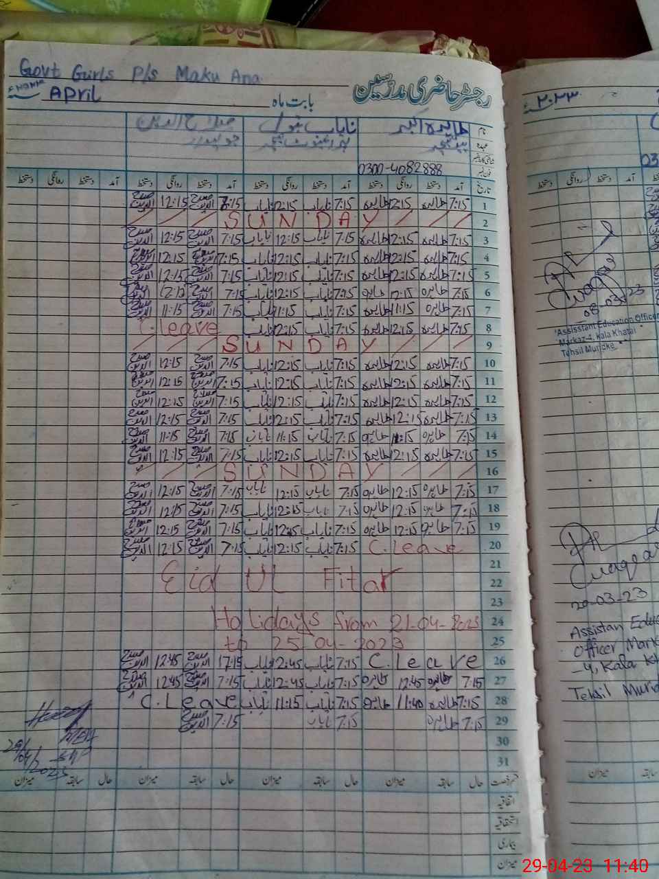 | Name: TA**** AK**** Designation: (School Headmaster's/Headmistress's) PST Phone/Cell Number: 03**** |