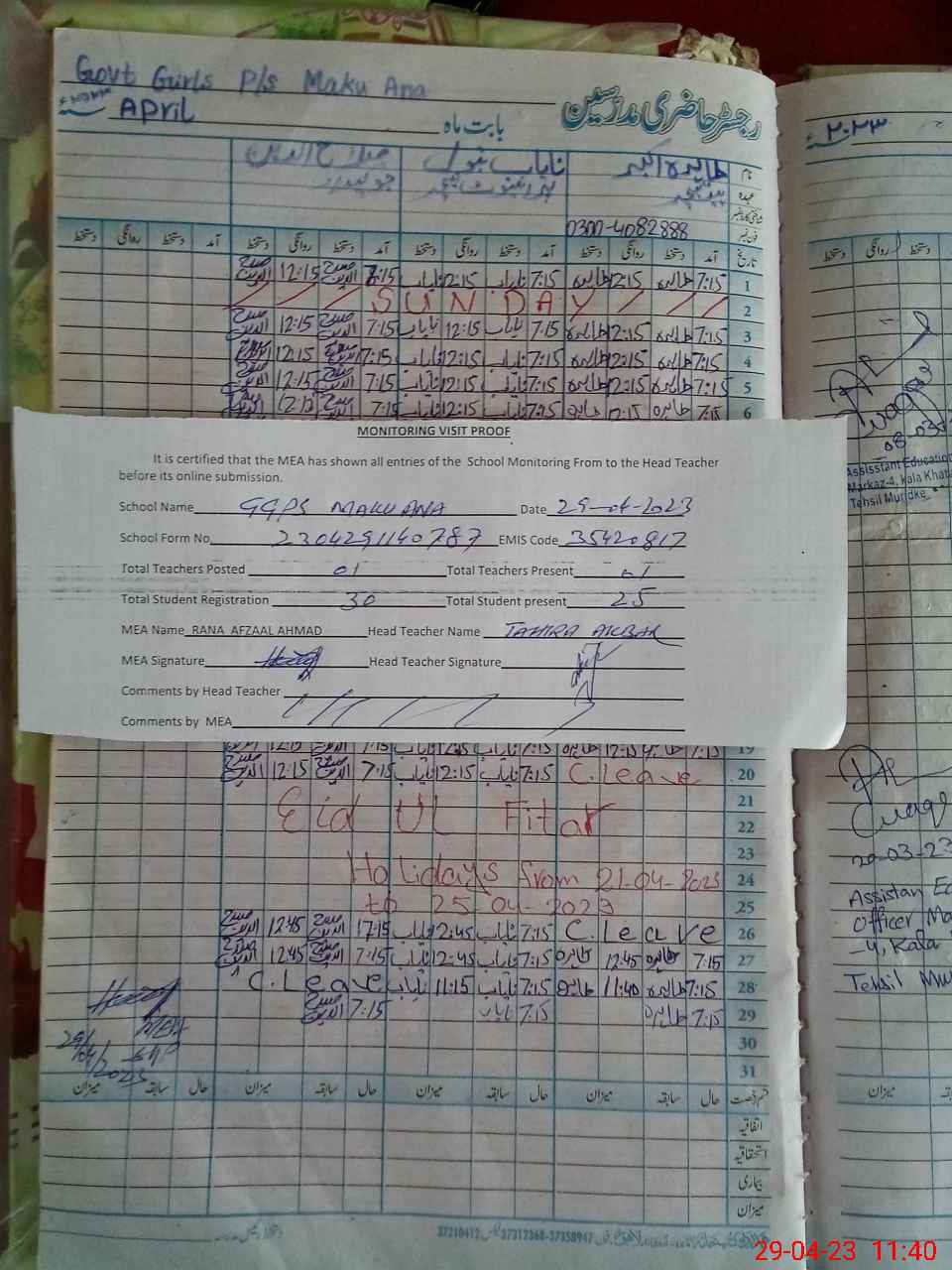 | Attendance Register | Head Teacher | MEA with School | Visit Proof |