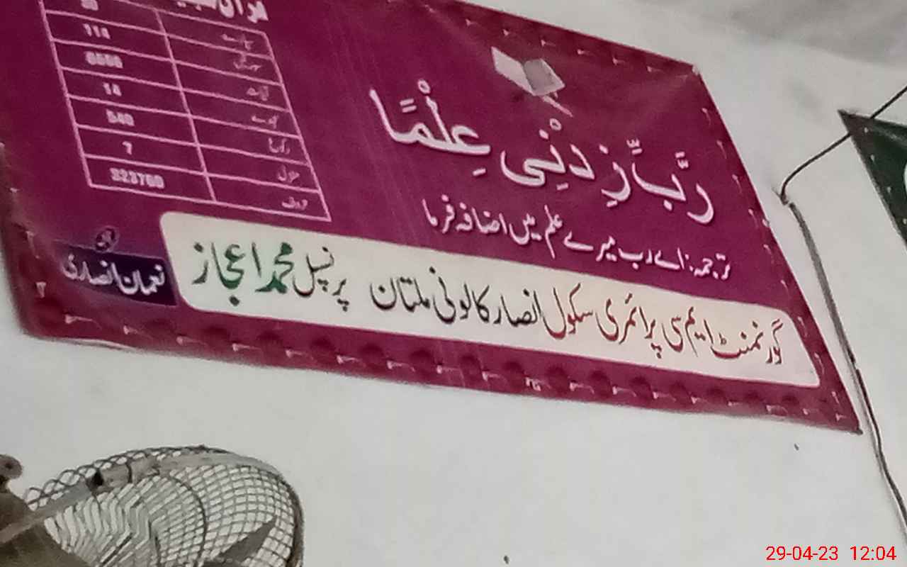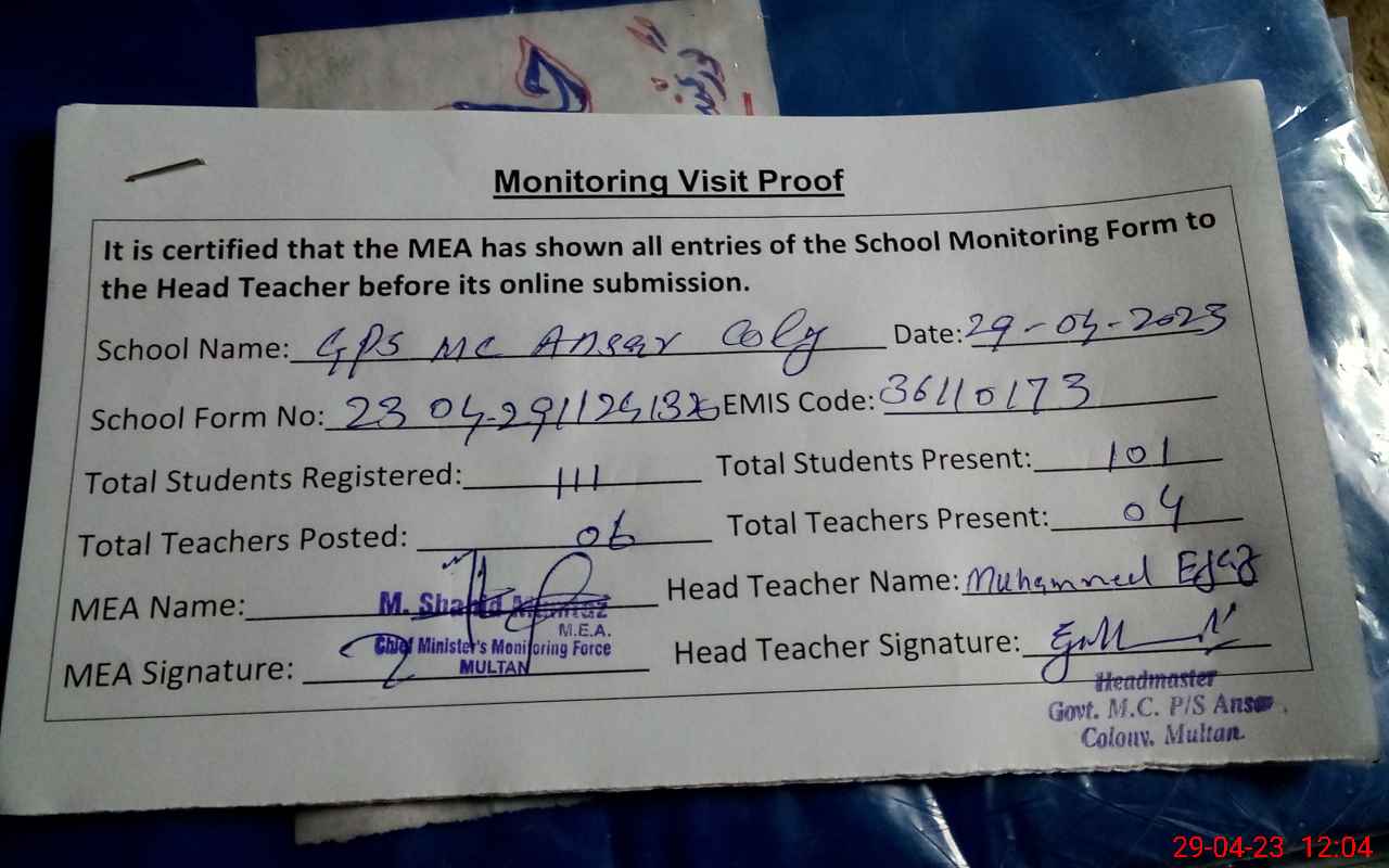 | EMIS Code: 36110173 | Name of School: GPS MC ANSAR COLONY BUDHLA ROAD MULTAN | |||