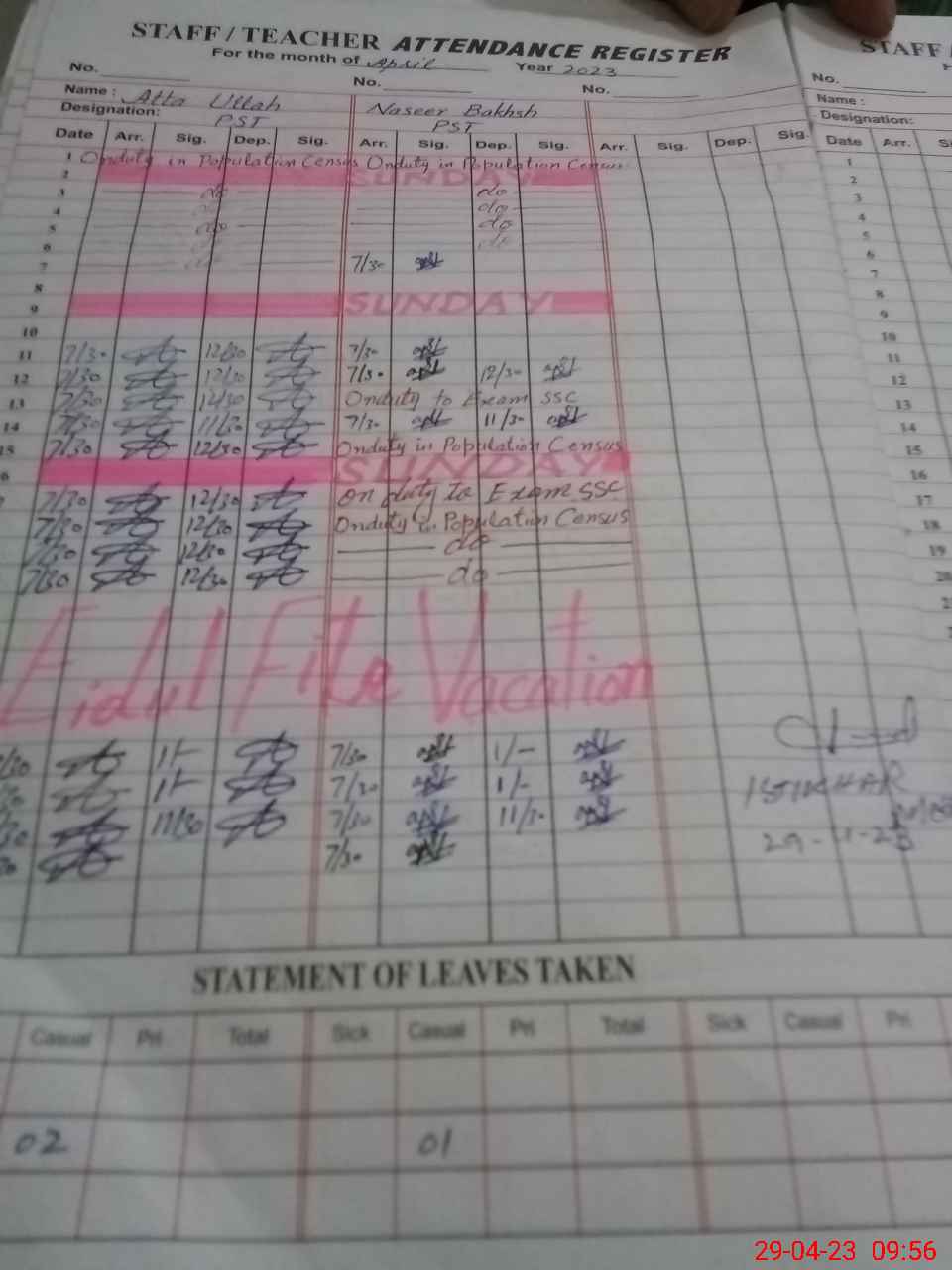| CNIC | Full Name | Designation | R/C | Absence During Last Calender Month |