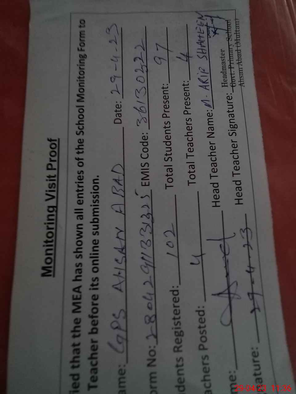 | EMIS Code: 36130322 | Name of School: GPS AHSAN ABAD | |||
