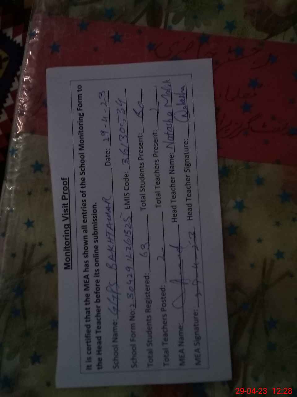 | Attendance Register | Head Teacher | MEA with School | Visit Proof |
