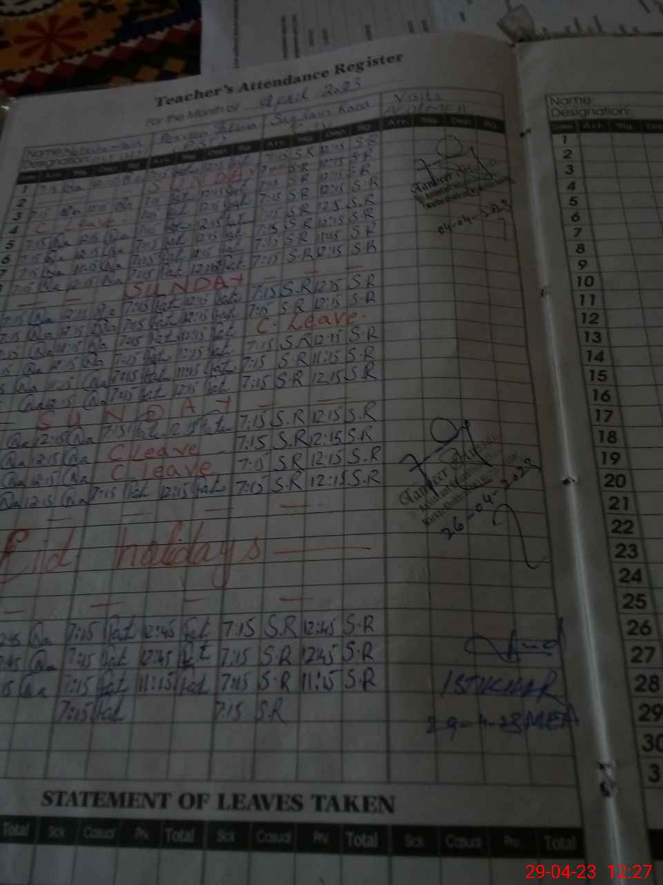 | Leave | Duty | Absent | Maternity | Medical | Ex- Pak |