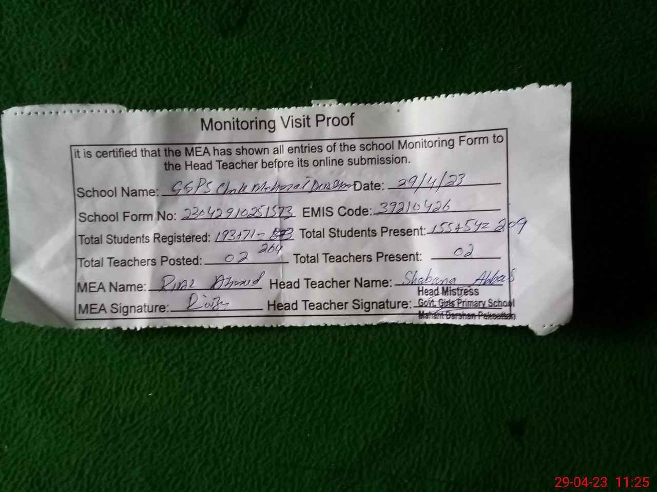 | Attendance Register | Head Teacher | MEA with School | Visit Proof |