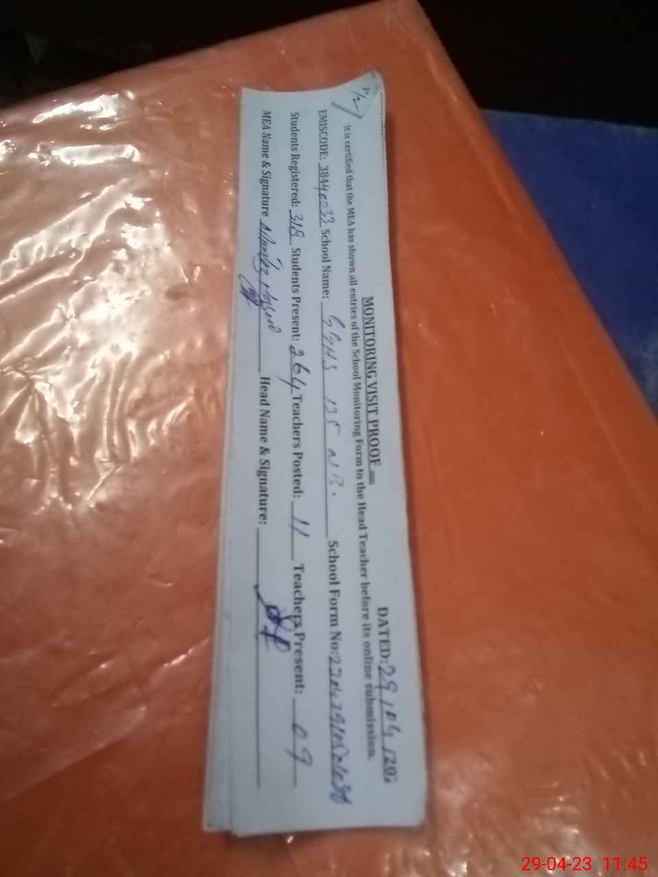 | Attendance Register | Head Teacher | MEA with School | Visit Proof |