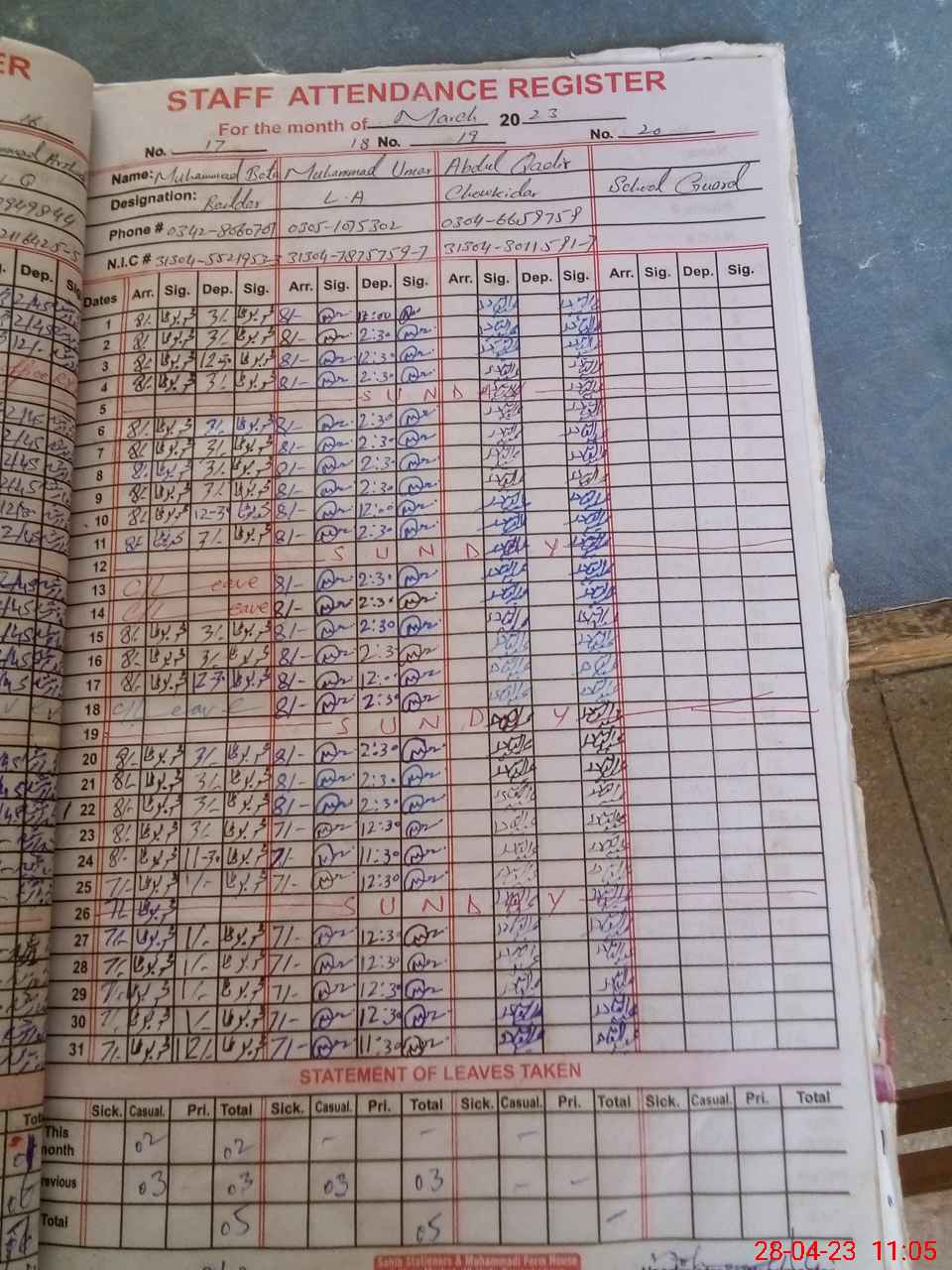 | CNIC | Full Name | Designation | R/C | Absence During Last Calender Month |