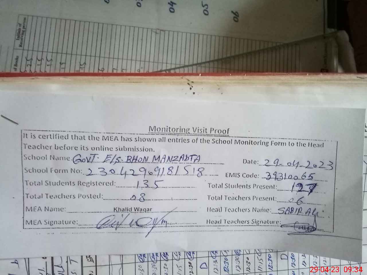 | Attendance Register | Head Teacher | MEA with School | Visit Proof |
