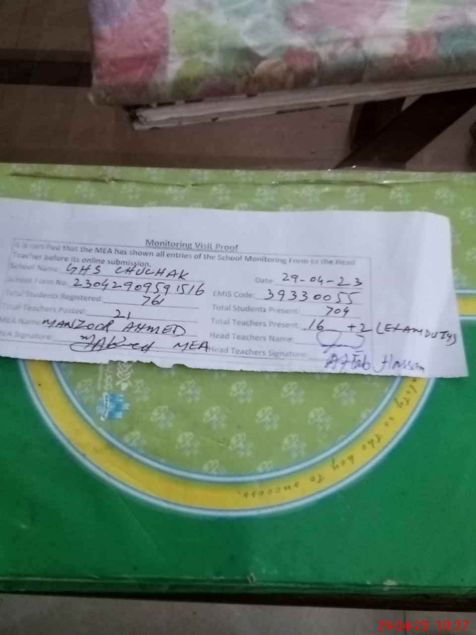 | Attendance Register | Head Teacher | MEA with School | Visit Proof |