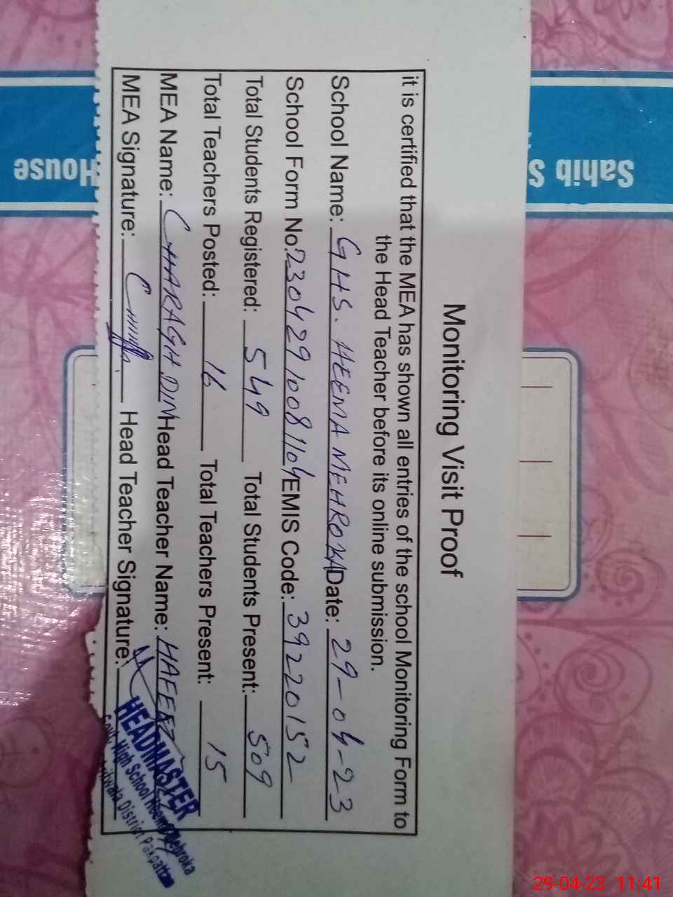 | Attendance Register | Head Teacher | MEA with School | Visit Proof |