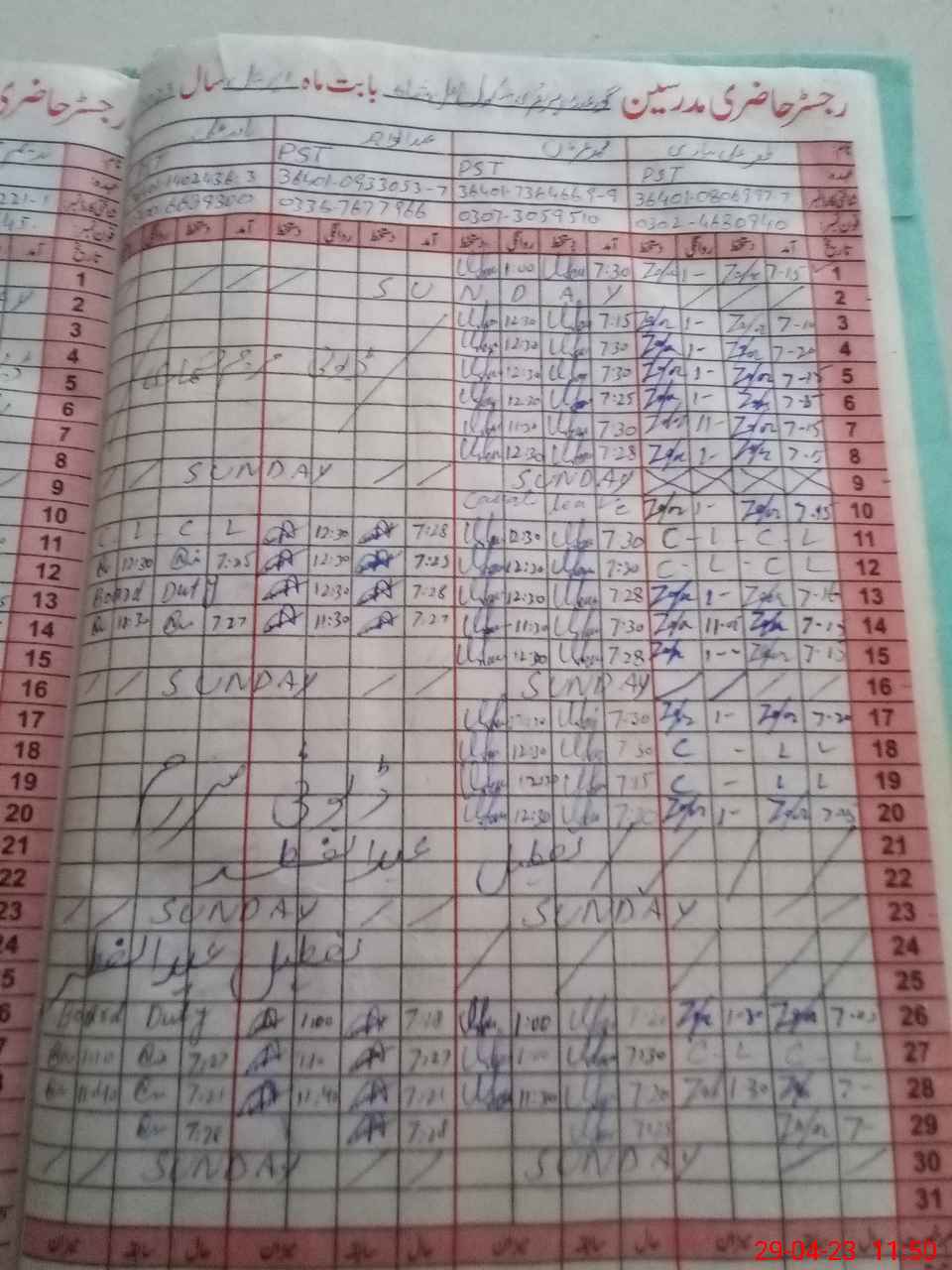 | CNIC | Full Name | Designation | R/C | Absence During Last Calender Month |