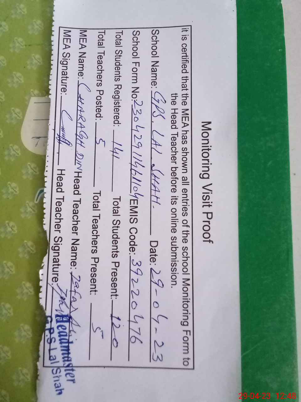 | Attendance Register | Head Teacher | MEA with School | Visit Proof |