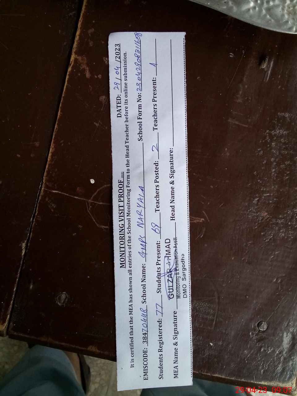 | Attendance Register | Head Teacher | MEA with School | Visit Proof |