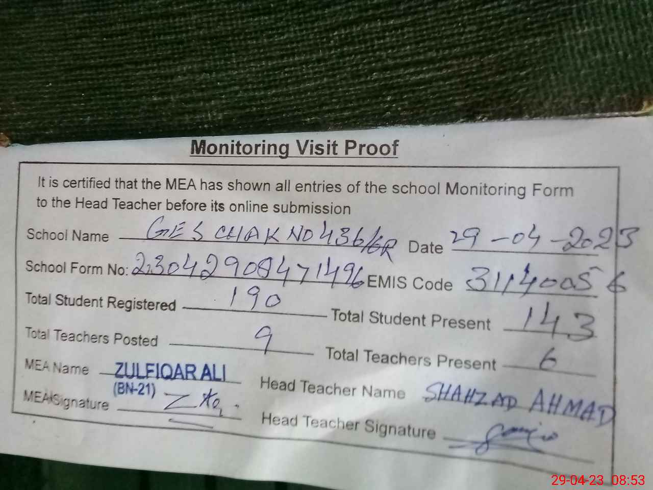 | Attendance Register | Head Teacher | MEA with School | Visit Proof |