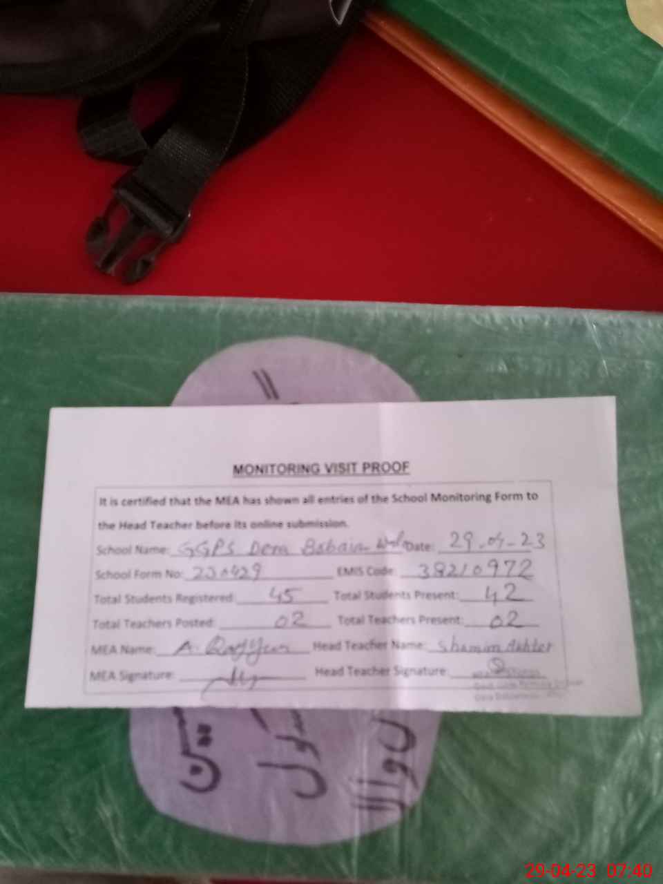 | Attendance Register | Head Teacher | MEA with School | Visit Proof |