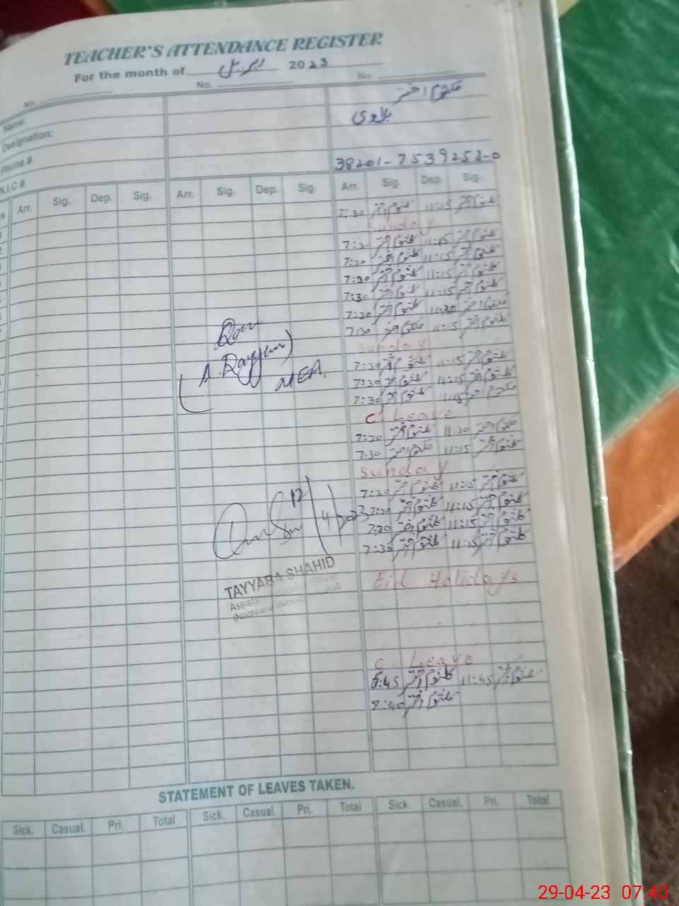 | CNIC | Full Name | Designation | R/C | Absence During Last Calender Month |