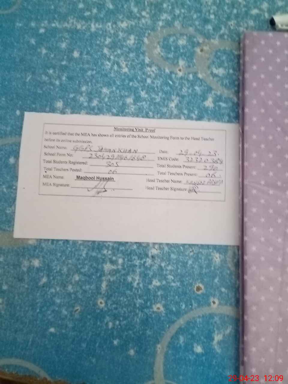 | Attendance Register | Head Teacher | MEA with School | Visit Proof |