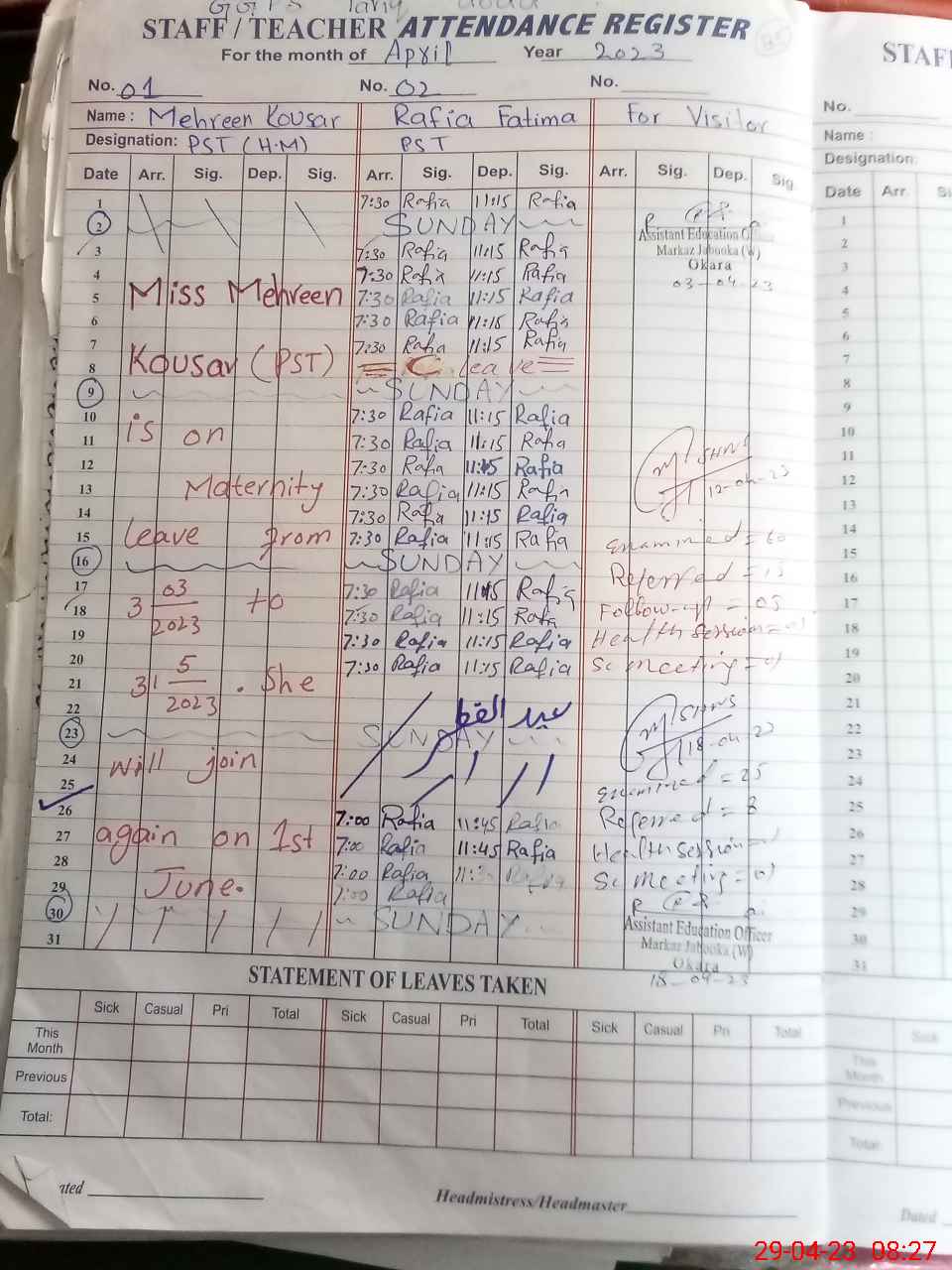 | Attendance Register | Head Teacher | MEA with School | Visit Proof |