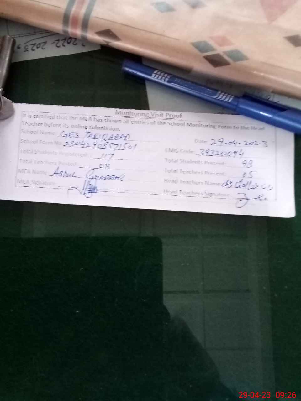 | Attendance Register | Head Teacher | MEA with School | Visit Proof |