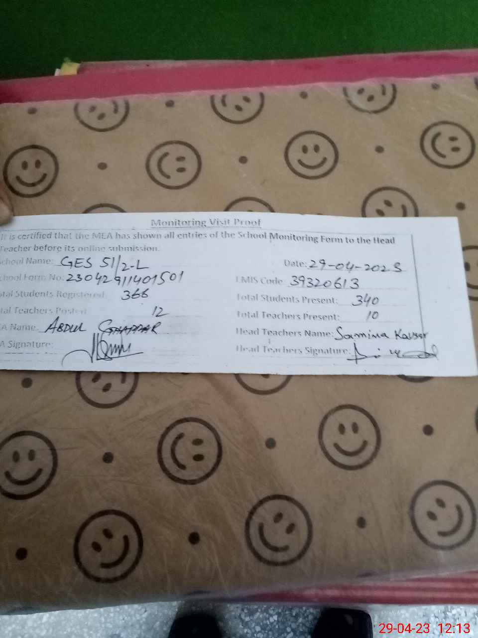 | Attendance Register | Head Teacher | MEA with School | Visit Proof |