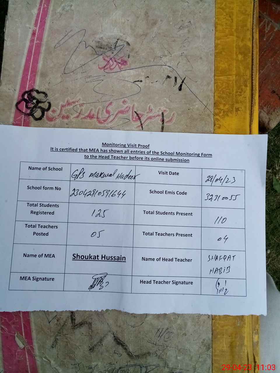 | Attendance Register | Head Teacher | MEA with School | Visit Proof |
