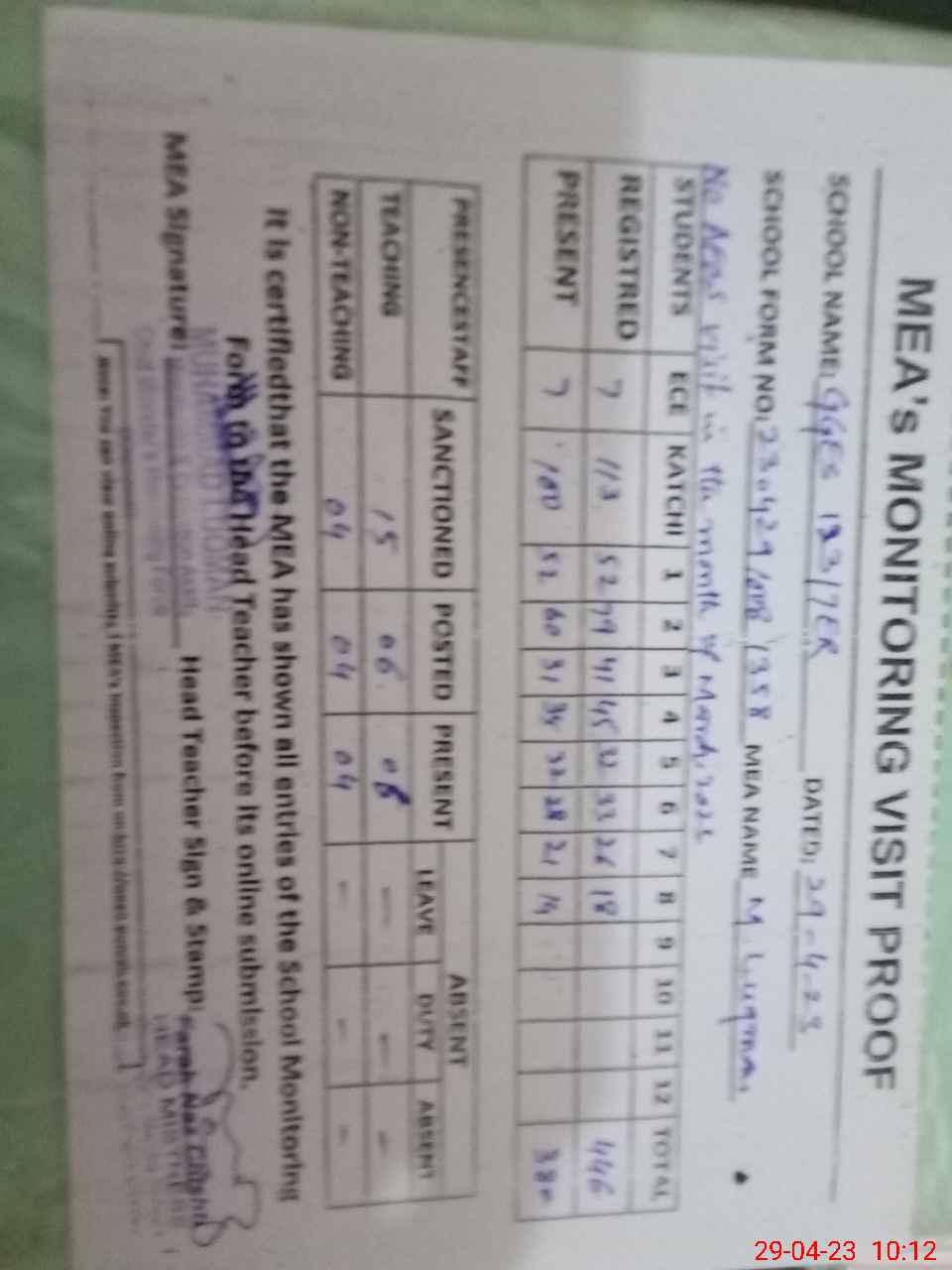 | Attendance Register | Head Teacher | MEA with School | Visit Proof |