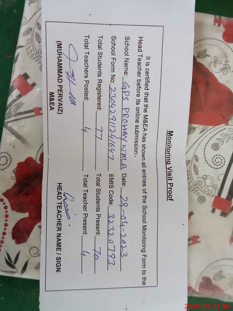 | Attendance Register | Head Teacher | MEA with School | Visit Proof |